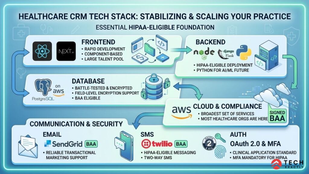 The tech stack for a healthcare CRM isn’t extraordinary. What really matters is choosing HIPAA-eligible options at every layer and not complicating the architecture. This is because the entire system is only about data management and workflow automation.