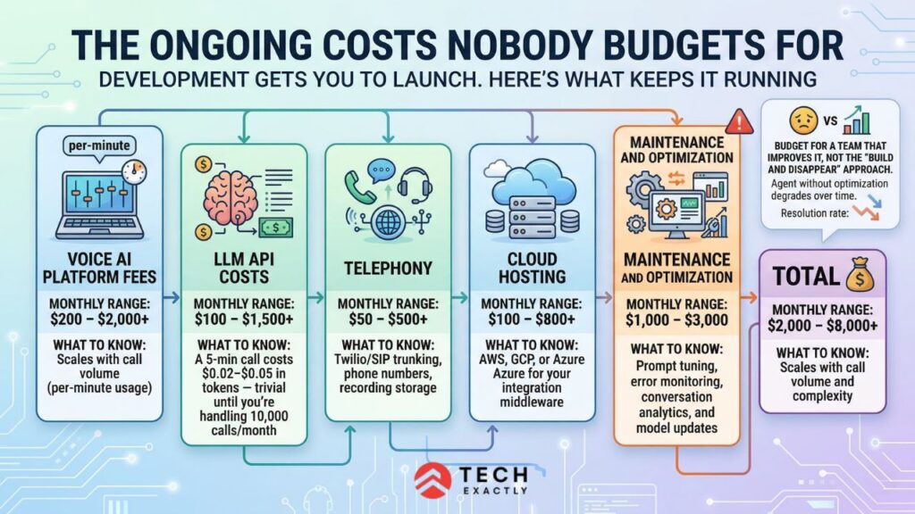 The maintenance line is the one most teams skip — and regret. A voice AI agent without ongoing optimization degrades over time. Prompts drift, edge cases accumulate, and call resolution rates drop. Budget for a team that watches the system and improves it, not the “build and disappear” approach.