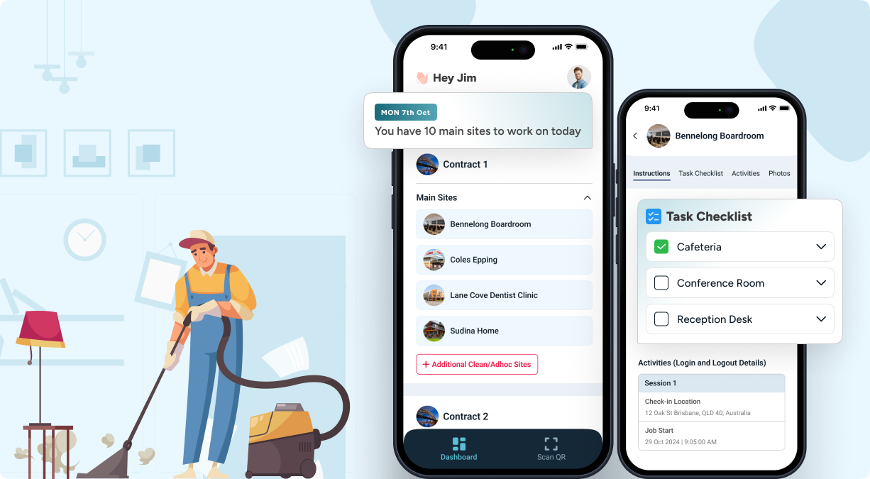 Cleaners could check in by scanning QR codes at job sites, with location data verified via geofencing. This eliminates GPS spoofing and ensures a cleaner’s presence at the correct site.