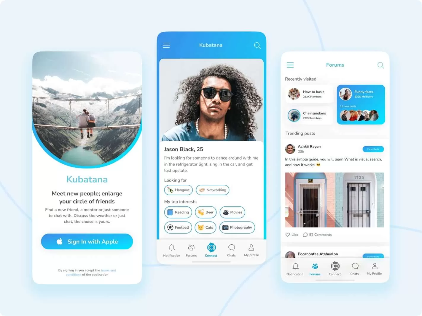 Our goal was to design the app’s UI/UX for a seamless user experience by creating a clear and simple onboarding procedure, ensuring flexible information architecture and user flows, and making sure all linked elements worked effortlessly together. We aimed to make everyone feel accepted regardless of caste, creed, ethnicity, language, or gender, to enhance feelings of safety and security, and to communicate information about other people’s interests and preferences.